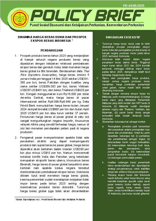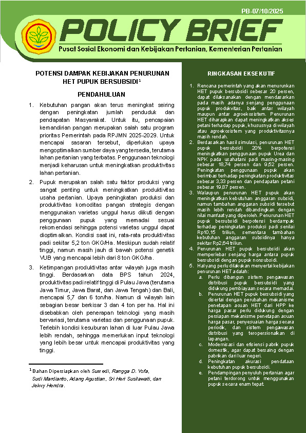 Policy Brief Pusat Sosial Ekonomi dan Kebijakan Pertanian (PSEKP), Kementerian Pertanian, menyajikan informasi ringkas dan analisis berbasis bukti mengenai isu-isu aktual di sektor pertanian. Publikasi ini dilengkapi dengan temuan lapang serta rekomendasi kebijakan yang dapat diterapkan. Policy Brief disusun sebagai bahan masukan bagi pimpinan di lingkup Kementerian Pertanian dan para pemangku kepentingan terkait untuk mendukung perumusan kebijakan pertanian yang lebih tepat sasaran, responsif, dan berkelanjutan. Bahan penyusunannya berasal dari hasil kajian yang dilakukan PSEKP, serta analisis data sekunder dari berbagai sumber. Pembaca dapat memanfaatkan Policy Brief ini untuk menambah pengetahuan atau rujukan. Semoga bermanfaat.