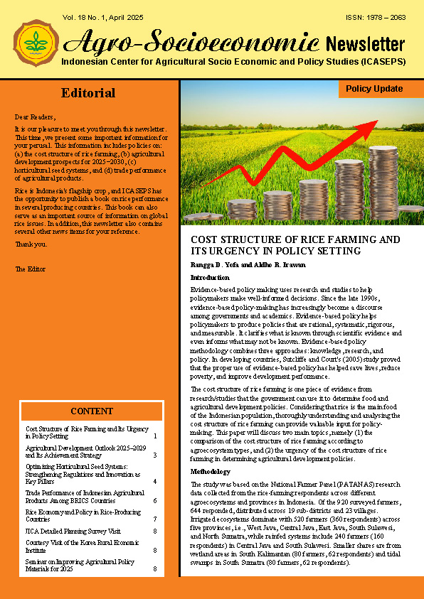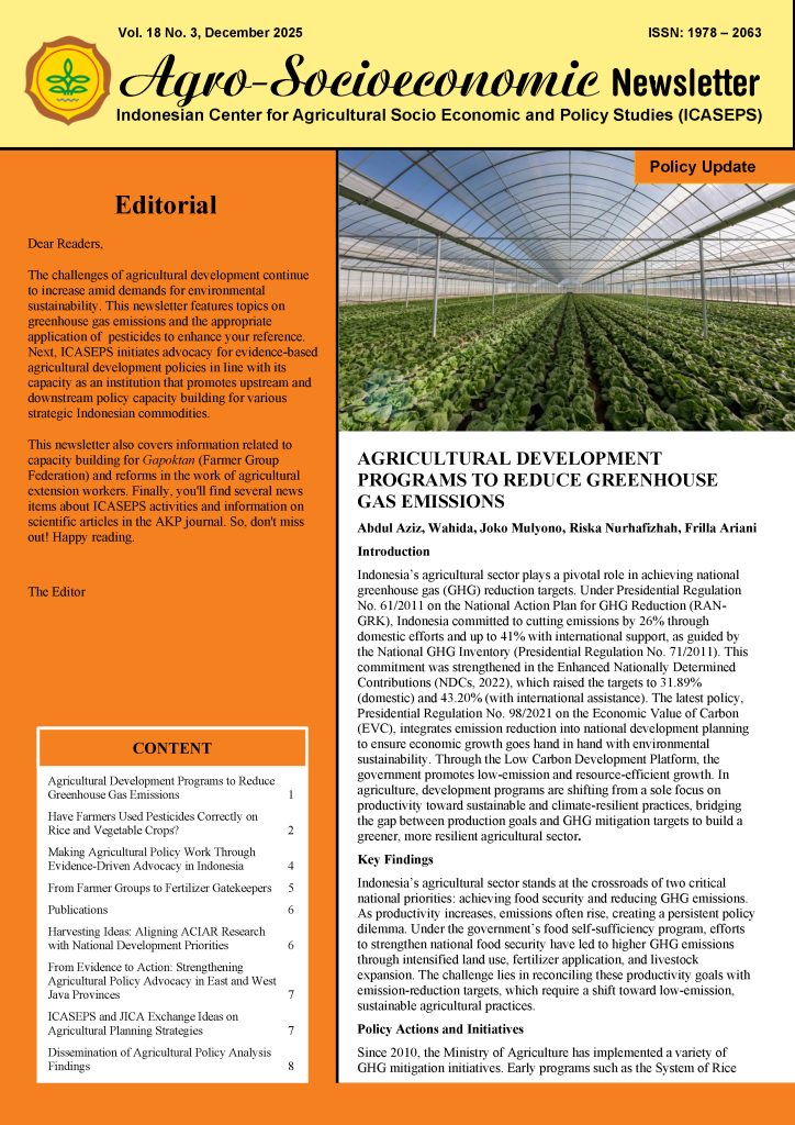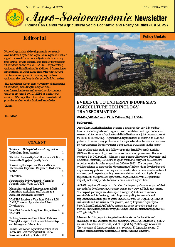 Agro-Socioeconomic Newsletter merupakan publikasi berbahasa Inggris yang diterbitkan oleh Pusat Sosial Ekonomi dan Kebijakan Pertanian (PSEKP/ICASEPS), Kementerian Pertanian, sebanyak 3 kali dalam setahun. Newsletter ini menyajikan beragam informasi terkini seputar Policy Update, Policy Development, dan Policy Issues di sektor pertanian, serta memuat informasi mengenai ICASEPS Publications dan ICASEPS News. Seluruh edisi Newsletter dapat diunduh secara gratis sebagai bahan informasi dan referensi bagi pembaca serta pemangku kepentingan terkait.